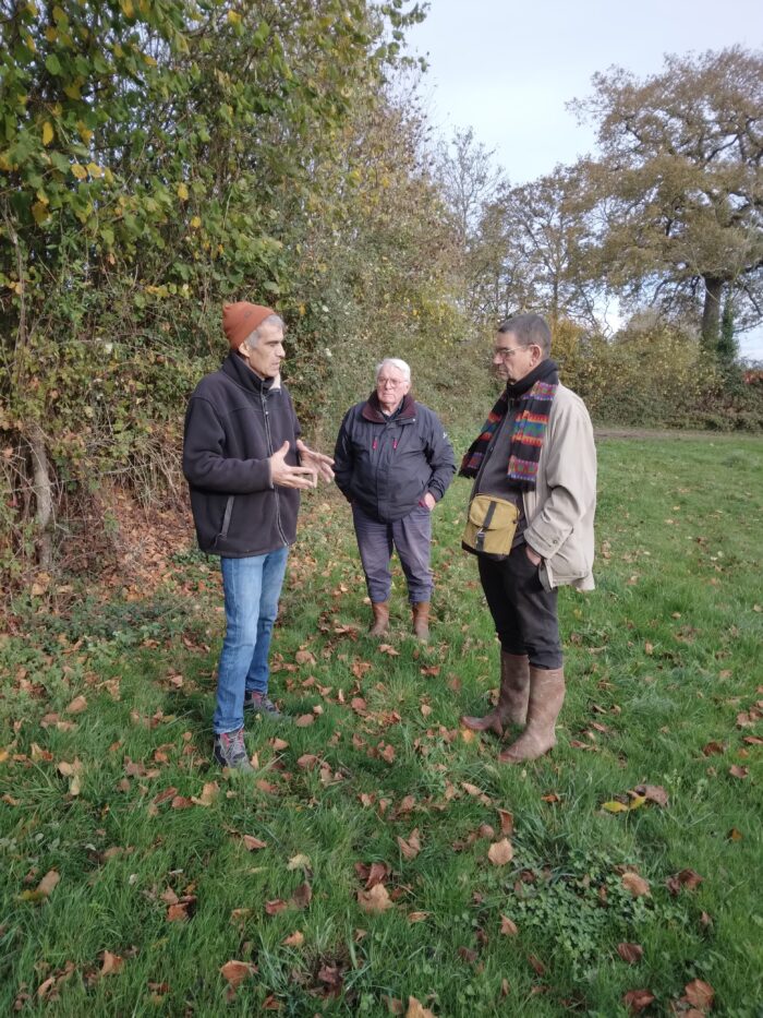 Henri Girard ( à droite) en visite de haies bocagères chez Dominique Bordeau à Peuton.